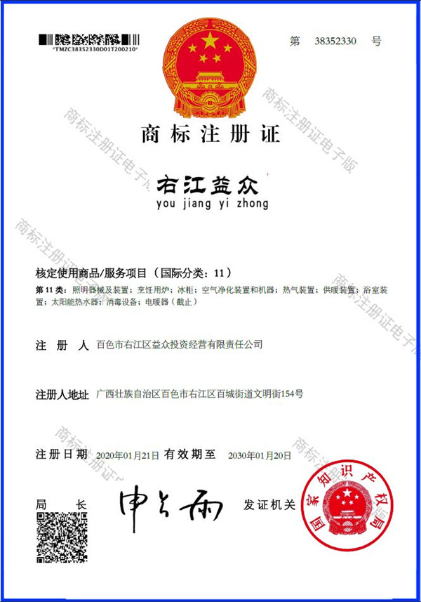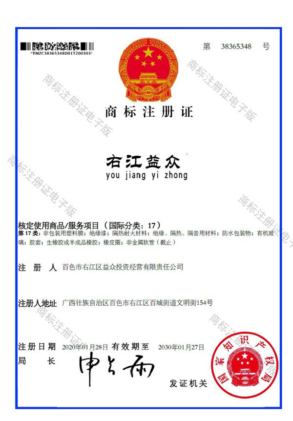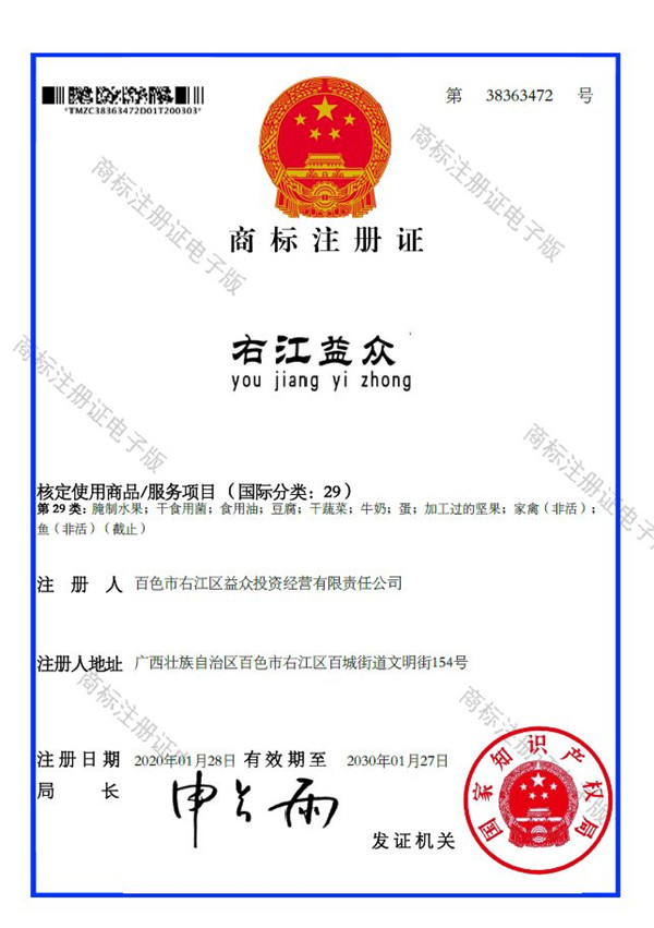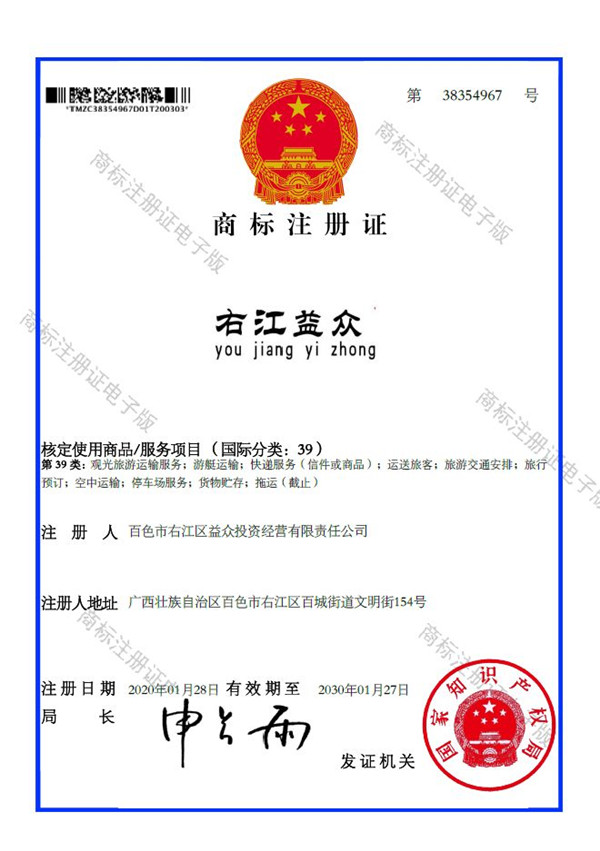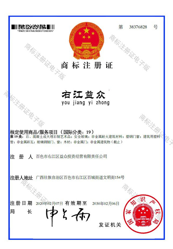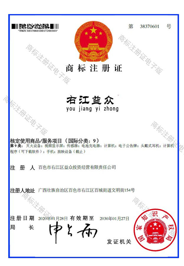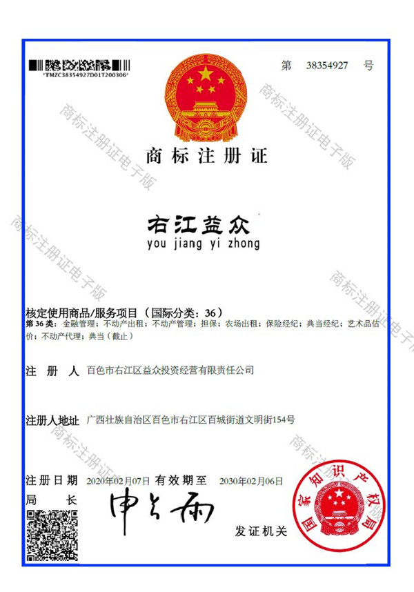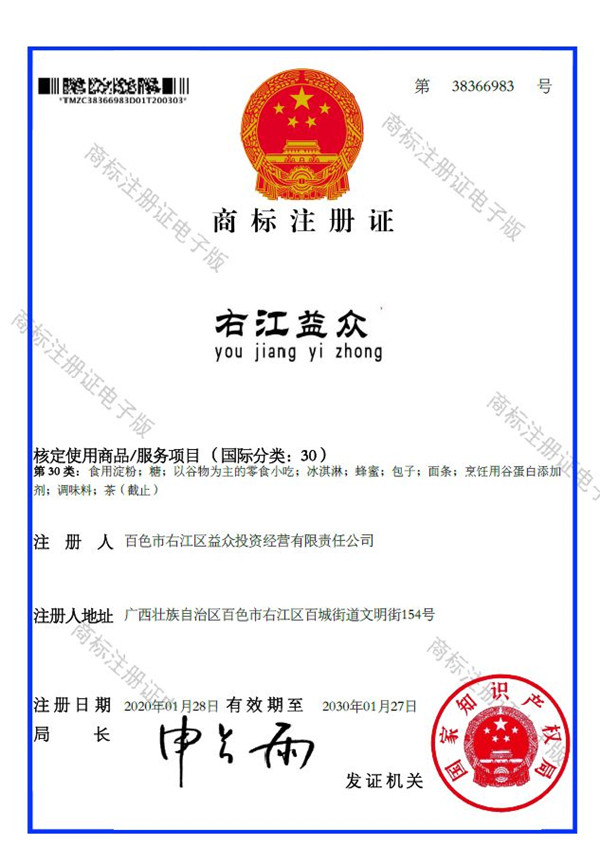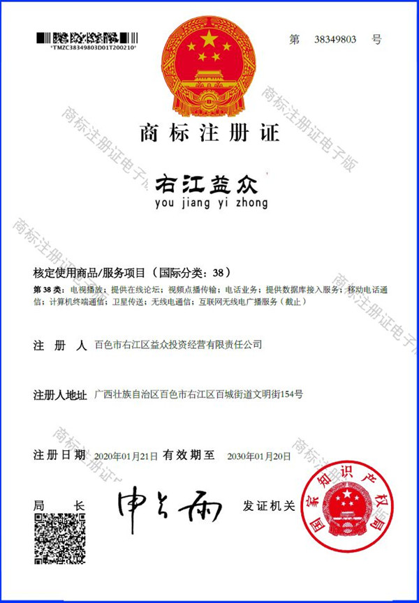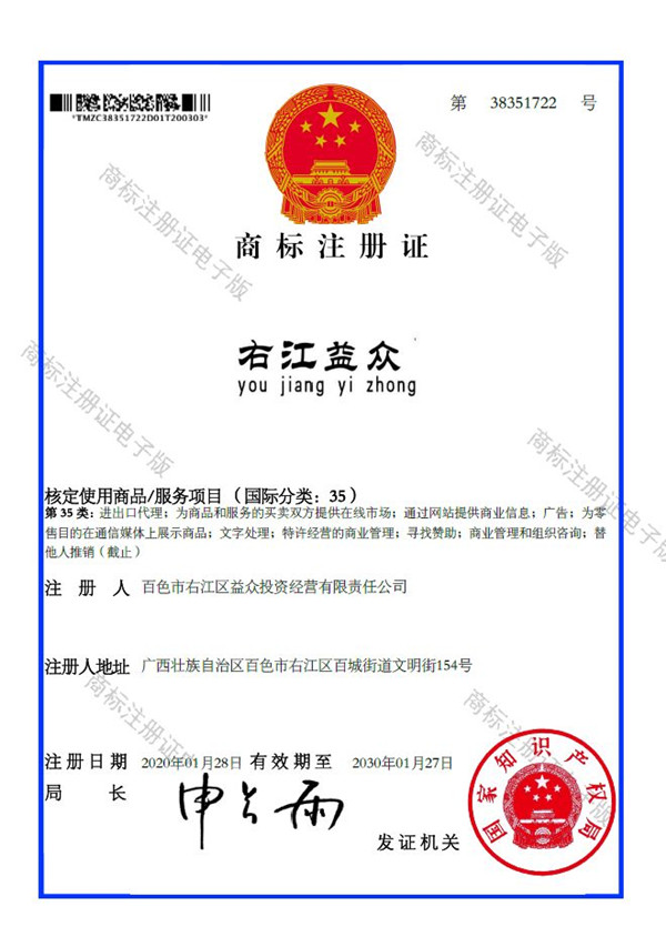 2019年4月,為樹立企業(yè)品牌形象,充分展現(xiàn)品牌價(jià)值,廣西百色益眾投資有限公司按照建設(shè)現(xiàn)代企業(yè)的方向和標(biāo)準(zhǔn),啟動(dòng)品牌商標(biāo)注冊(cè)申報(bào)工作,經(jīng)過6個(gè)月的審核期和3個(gè)月的公告期,“右江益眾”45個(gè)大類商標(biāo)品牌第一時(shí)間成功獲批?!坝医姹姟逼放频某晒ψ?cè),有利于公司更好地參與市場(chǎng)競(jìng)爭(zhēng),同時(shí),對(duì)于強(qiáng)化企業(yè)內(nèi)部管理、樹立良好的企業(yè)形象、提升公司美譽(yù)度也可起到積極的助推作用。