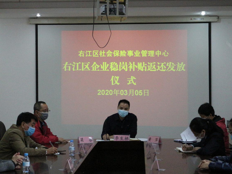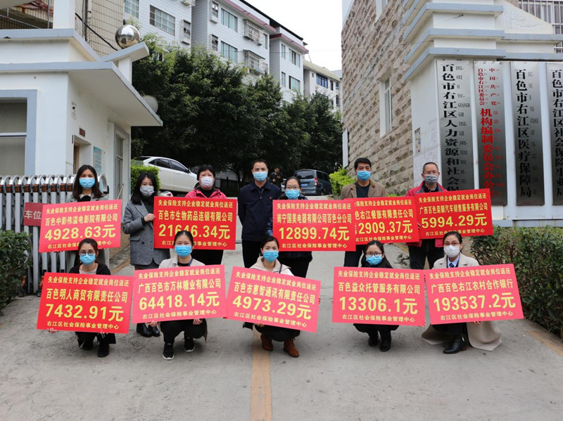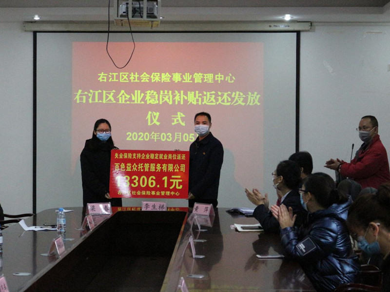 ??? 3月5日,在右江區(qū)社會(huì)保險(xiǎn)事業(yè)管理中心召開(kāi)穩(wěn)崗補(bǔ)貼返還工作會(huì)議暨企業(yè)穩(wěn)崗補(bǔ)貼返還發(fā)放儀式,我公司作為首批返還企業(yè)代表之一應(yīng)邀參加,會(huì)上社保中心主任李生梯對(duì)我公司響應(yīng)穩(wěn)崗補(bǔ)貼政策給予高度肯定,期望通過(guò)穩(wěn)崗補(bǔ)貼返還為公司的穩(wěn)定復(fù)產(chǎn)助力。截止目前,我公司有8家子公司符合享受失業(yè)保險(xiǎn)穩(wěn)崗返還補(bǔ)貼條件,獲得穩(wěn)崗返還補(bǔ)貼3.6萬(wàn)元,惠及企業(yè)員工約150人。(通訊員:黃 芬)