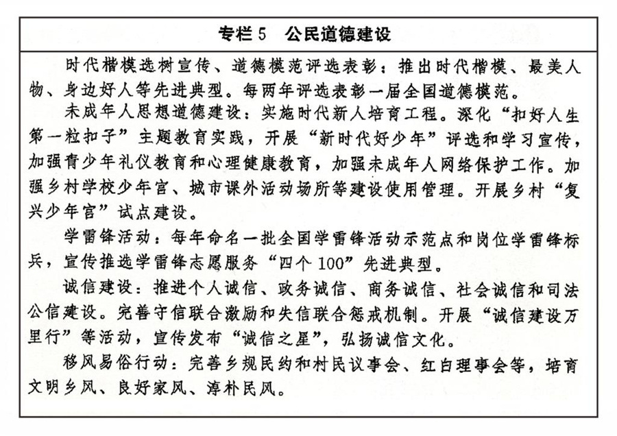傳承弘揚中華傳統美德,加強社會公德、職業(yè)道德、家庭美德、個人品德建設,加強家庭、家教、家風建設。加強對革命、建設、改革時期各類先進典型的學習宣傳,尊崇褒揚英雄模范,關心關愛先進典型人物。健全家庭、學校、政府、社會相結合的思想道德教育體系,把立德樹人貫穿學校教育全過程。發(fā)揮優(yōu)秀文化產品陶冶道德情操的作用,完善市民公約、鄉(xiāng)規(guī)民約、學生守則、團體章程等社會規(guī)范,廣泛開展弘揚時代新風行動,深化道德領域突出問題治理。加強農村思想道德建設,創(chuàng)新文化科技衛(wèi)生“三下鄉(xiāng)”長效機制。