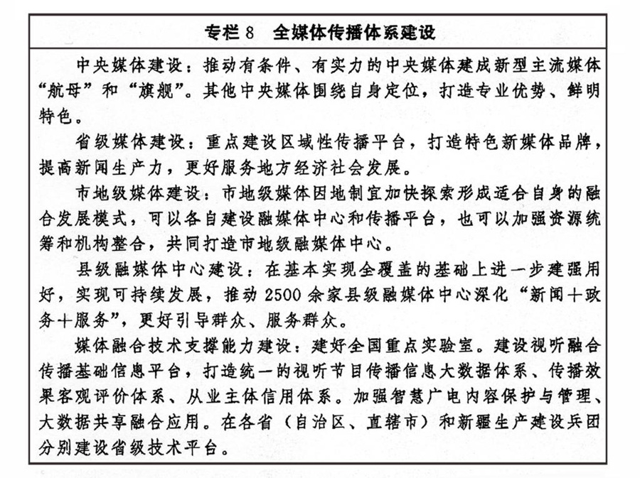 加快推進媒體深度融合發(fā)展,有效整合各種媒介資源、生產要素,推動在信息內容、技術應用、平臺終端、管理手段等方面共融互通,打造一批具有強大影響力、競爭力的新型主流媒體。統籌處理好傳統媒體和新興媒體、中央媒體和地方媒體、主流媒體和商業(yè)平臺、大眾化媒體和專業(yè)性媒體的關系,建立以內容建設為根本、先進技術為支撐、創(chuàng)新管理為保障的全媒體傳播體系。推進內容生產供給側結構性改革,完善高質量內容產出機制,推廣互動式、服務式、場景式傳播。強化新一代信息技術支撐引領作用,支持主流媒體重塑采編流程、建設平臺終端、優(yōu)化管理手段、強化版權保護、打造媒體資源數據庫、提升內容生產力、占據傳播制高點。創(chuàng)新媒體業(yè)態(tài)、傳播方式和運營模式,強化用戶連接,發(fā)揮制度優(yōu)勢和市場作用,增強主流媒體競爭力。