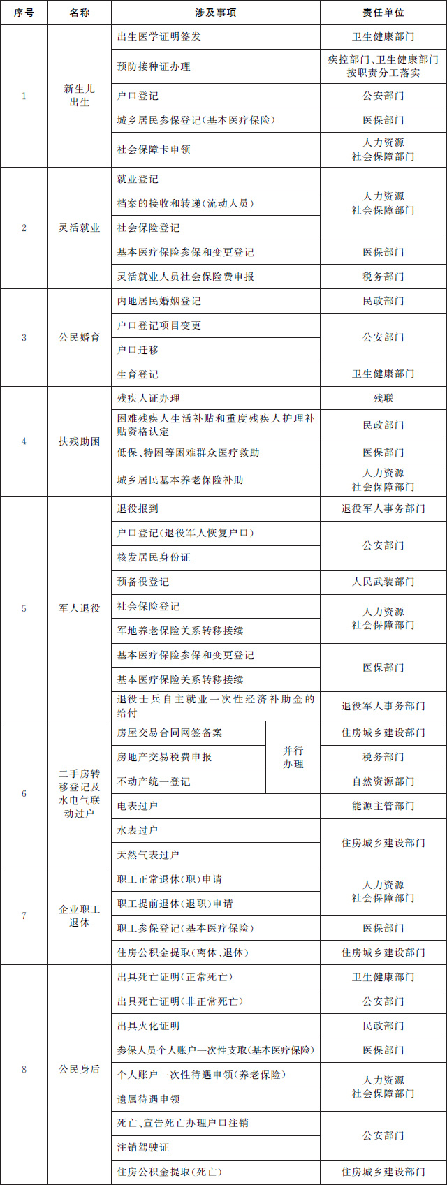 (二)推進個人全生命周期相關(guān)政務服務事項“一件事一次辦”。圍繞個人從出生到身后全生命周期的重要階段,梳理集成同一階段內(nèi)需要辦理的多個單一政務服務事項,為群眾提供新生兒出生、入園入學、大中專學生畢業(yè)、就業(yè)、就醫(yī)、婚育、扶殘助困、軍人退役、二手房交易及水電氣聯(lián)動過戶、退休、身后等集成化辦理服務,切實提升群眾辦事便捷度,減少跑動次數(shù)。