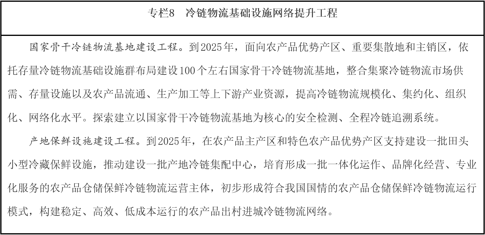 提高冷鏈物流質(zhì)量效率。大力發(fā)展鐵路冷鏈運輸和集裝箱公鐵水聯(lián)運,對接主要農(nóng)產(chǎn)品產(chǎn)區(qū)和集散地,創(chuàng)新冷鏈物流干支銜接模式。發(fā)展“生鮮電商+產(chǎn)地直發(fā)”等冷鏈物流新業(yè)態(tài)新模式。推廣蓄冷箱、保溫箱等單元化冷鏈載器具和標(biāo)準(zhǔn)化冷藏車,促進冷鏈物流信息互聯(lián)互通,提高冷鏈物流規(guī)模化、標(biāo)準(zhǔn)化水平。依托國家骨干冷鏈物流基地、產(chǎn)銷冷鏈集配中心等大型冷鏈物流設(shè)施,加強生鮮農(nóng)產(chǎn)品檢驗檢疫、農(nóng)獸藥殘留及防腐劑、保鮮劑、添加劑合規(guī)使用等質(zhì)量監(jiān)管。研究推廣應(yīng)用冷鏈道路運輸電子運單,加強產(chǎn)品溯源和全程溫濕度監(jiān)控,將源頭至終端的冷鏈物流全鏈條納入監(jiān)管范圍,提升冷鏈物流質(zhì)量保障水平。健全進口冷鏈?zhǔn)称窓z驗檢疫制度,筑牢疫情外防輸入防線。