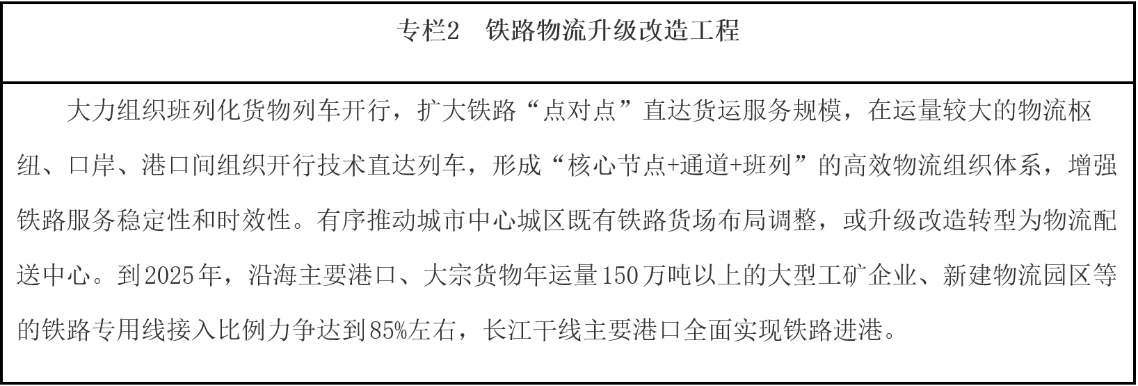 推進結(jié)構(gòu)性降成本。加快推進鐵路專用線進港區(qū)、連園區(qū)、接廠區(qū),合理有序推進大宗商品等中長距離運輸“公轉(zhuǎn)鐵”、“公轉(zhuǎn)水”。完善集裝箱公鐵聯(lián)運銜接設(shè)施,鼓勵發(fā)展集拼集運、模塊化運輸、“散改集”等組織模式,發(fā)揮鐵路干線運輸成本低和公路網(wǎng)絡(luò)靈活優(yōu)勢,培育有競爭力的“門到門”公鐵聯(lián)運服務(wù)模式,降低公鐵聯(lián)運全程物流成本。統(tǒng)籌沿海港口綜合利用,提升大型港口基礎(chǔ)設(shè)施服務(wù)能力,提高碼頭現(xiàn)代化專業(yè)化規(guī)?;?,加快推進鐵水聯(lián)運銜接場站改造,提高港口鐵路專用線集疏網(wǎng)絡(luò)效能,優(yōu)化作業(yè)流程。完善內(nèi)河水運網(wǎng)絡(luò),統(tǒng)籌江海直達、江海聯(lián)運發(fā)展,發(fā)揮近海航線、長江水道、珠江水道等水運效能,穩(wěn)步推進貨物運輸“公轉(zhuǎn)水”。推進鐵水聯(lián)運業(yè)務(wù)單證電子化,促進鐵路、港口信息互聯(lián),實現(xiàn)鐵路現(xiàn)車、裝卸車、貨物在途、到達預(yù)確報以及港口裝卸、貨物堆存、船舶進出港、船期艙位預(yù)定等鐵水聯(lián)運信息交換共享。支持港口、鐵路場站加快完善集疏運油氣管網(wǎng),有效對接石化等產(chǎn)業(yè)布局,提高管道運輸比例。
