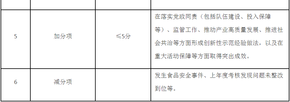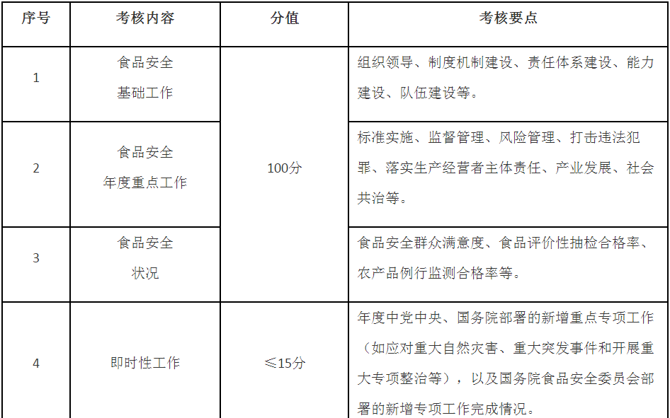 第五條 考核內(nèi)容主要包括食品安全基礎(chǔ)工作推進(jìn)、年度重點(diǎn)工作落實、食品安全狀況等,同時設(shè)置即時性工作評價和加減分項(考核內(nèi)容要點(diǎn)見附件)。具體考核指標(biāo)及分值在年度食品安全工作考核方案及其細(xì)則中明確,設(shè)置要科學(xué)合理,可操作、可評價、可區(qū)分,切實減輕基層負(fù)擔(dān)。