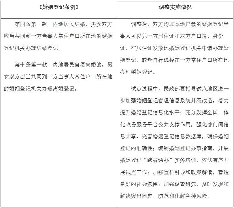 國務(wù)院決定在內(nèi)地居民婚姻登記“跨省通辦”試點(diǎn)地區(qū)暫時調(diào)整實施《婚姻登記條例》有關(guān)規(guī)定目錄