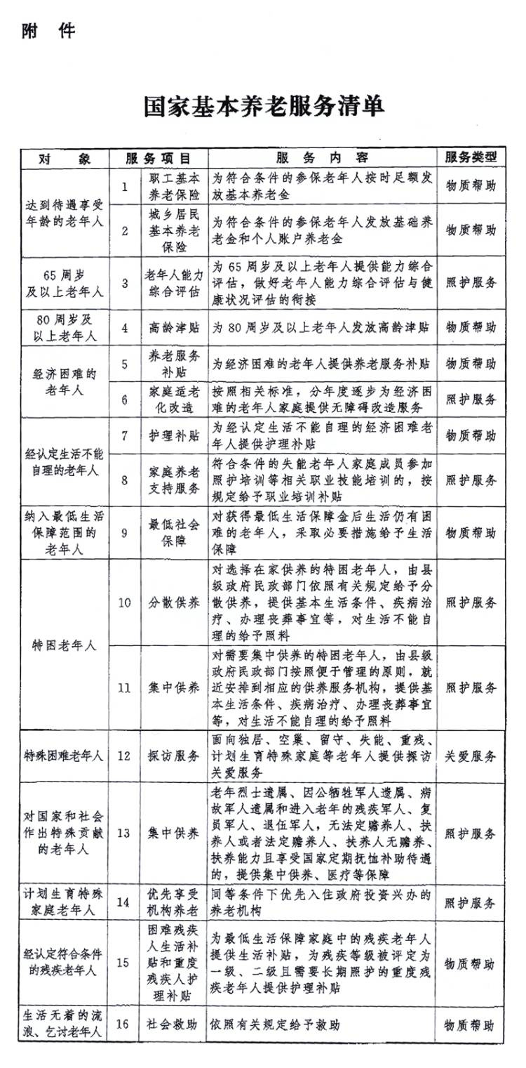 (一)制定落實基本養(yǎng)老服務(wù)清單。各地區(qū)各有關(guān)部門要嚴格落實《國家基本養(yǎng)老服務(wù)清單》(見附件)?!秶一攫B(yǎng)老服務(wù)清單》明確的對象、項目、內(nèi)容等,根據(jù)經(jīng)濟社會發(fā)展水平、財力狀況等因素動態(tài)調(diào)整,由民政部會同相關(guān)部門適時提出修訂意見,按程序報批后以部門名義印發(fā)實施。省級政府應(yīng)當對照《國家基本養(yǎng)老服務(wù)清單》制定并發(fā)布本地區(qū)基本養(yǎng)老服務(wù)具體實施方案及清單,明確具體服務(wù)對象、內(nèi)容、標準等,其清單應(yīng)當包含《國家基本養(yǎng)老服務(wù)清單》中的服務(wù)項目,且覆蓋范圍和實現(xiàn)程度不得低于《國家基本養(yǎng)老服務(wù)清單》要求。到2025年,基本養(yǎng)老服務(wù)制度體系基本健全,基本養(yǎng)老服務(wù)清單不斷完善,服務(wù)對象、服務(wù)內(nèi)容、服務(wù)標準等清晰明確,服務(wù)供給、服務(wù)保障、服務(wù)監(jiān)管等機制不斷健全,基本養(yǎng)老服務(wù)體系覆蓋全體老年人。