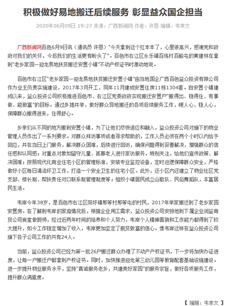 積極做好易地搬遷后續(xù)服務(wù) 彰顯益眾國企擔當-廣西新聞網(wǎng)文章鏈接