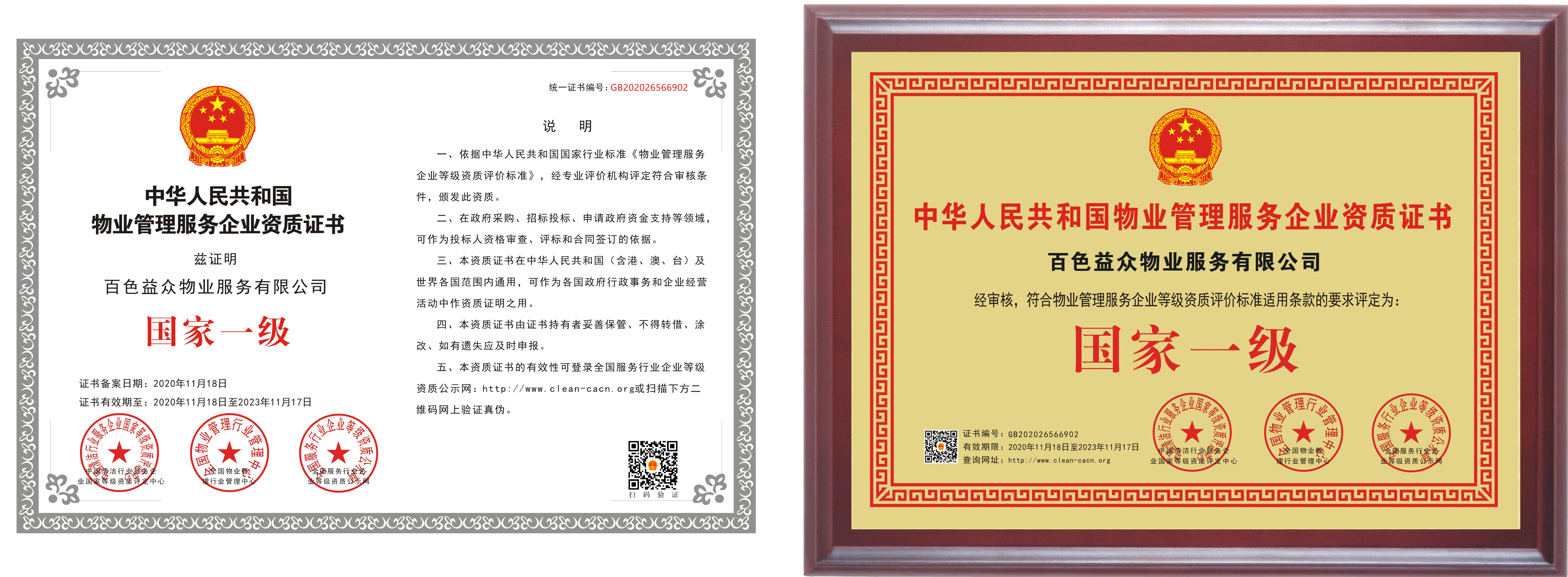 ????????近日,益眾物業(yè)公司通過了全國服務(wù)行業(yè)、物業(yè)管理行業(yè)等相關(guān)部門的審核評定,獲得了“國家一級(jí)物業(yè)管理服務(wù)”等多項(xiàng)資質(zhì)證書,成為一級(jí)資質(zhì)物業(yè)服務(wù)企業(yè)。