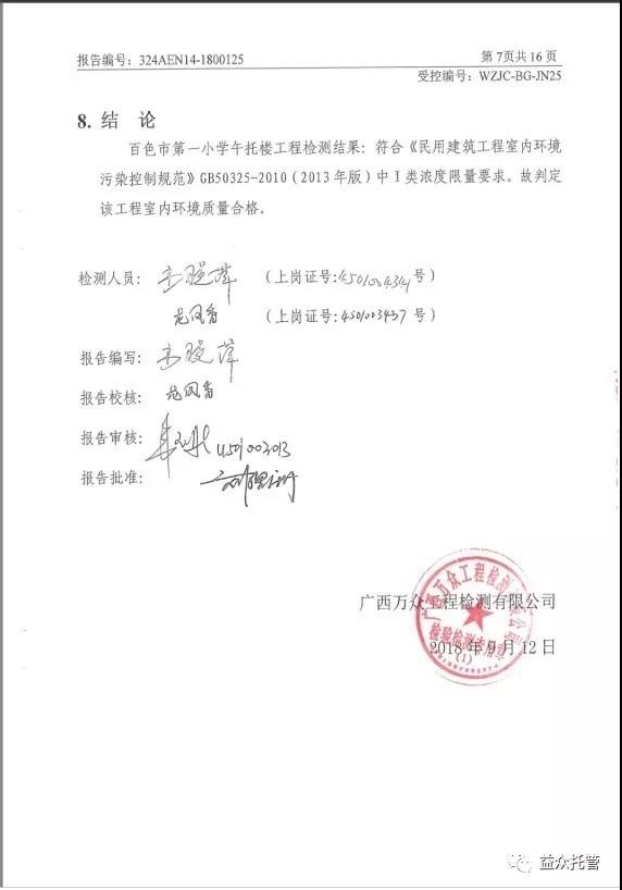 2??018年9月27日,廣西萬眾工程檢測有限公司提交了檢測報告,新托管樓室內(nèi)、室外檢測點甲醛、氨、苯、TVOC、氡濃度指標(biāo)均符合《民用建筑工程室內(nèi)環(huán)境污染控制規(guī)范》GB50325-2010(2013年版)中I類濃度限量要求,室內(nèi)環(huán)境質(zhì)量合格。