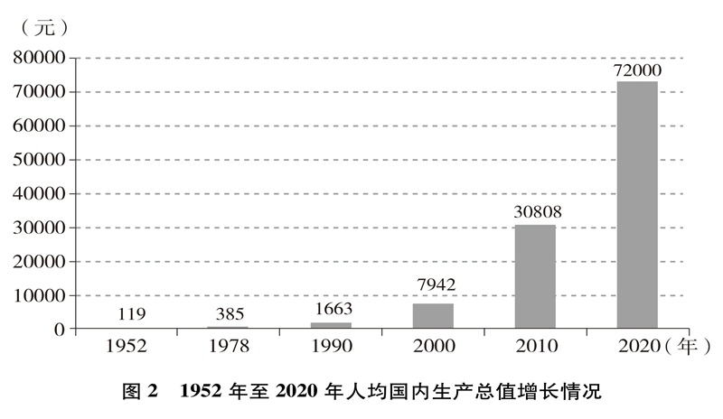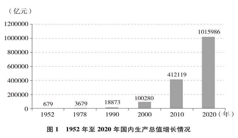 經(jīng)濟實力大幅提升。中國國內(nèi)生產(chǎn)總值從1952年的679.1億元躍升至2020年的101.6萬億元,經(jīng)濟總量占全球經(jīng)濟比重超過17%,穩(wěn)居世界第二大經(jīng)濟體(圖1)。人均國內(nèi)生產(chǎn)總值從1952年的幾十美元增至2020年的超過1萬美元,實現(xiàn)從低收入國家到中等偏上收入國家的歷史性跨越(圖2)。制造業(yè)增加值多年位居世界首位,220多種工業(yè)產(chǎn)品產(chǎn)量居世界第一,自2010年起連續(xù)11年位居世界第一制造業(yè)大國。中國已是全球貨物貿(mào)易第一大國、服務貿(mào)易第二大國、商品消費第二大國、外匯儲備第一大國,2020年利用外資居全球第一。不斷邁向共同富裕的14億多人口,其中有超過4億并不斷擴大的中等收入群體,是全球最具成長性的超大規(guī)模市場,中國經(jīng)濟充滿活力,具有巨大潛力和充足后勁。2020年,中國率先控制新冠肺炎疫情,率先復工復產(chǎn),率先實現(xiàn)經(jīng)濟增長由負轉正,充分彰顯中國經(jīng)濟的強勁韌性。