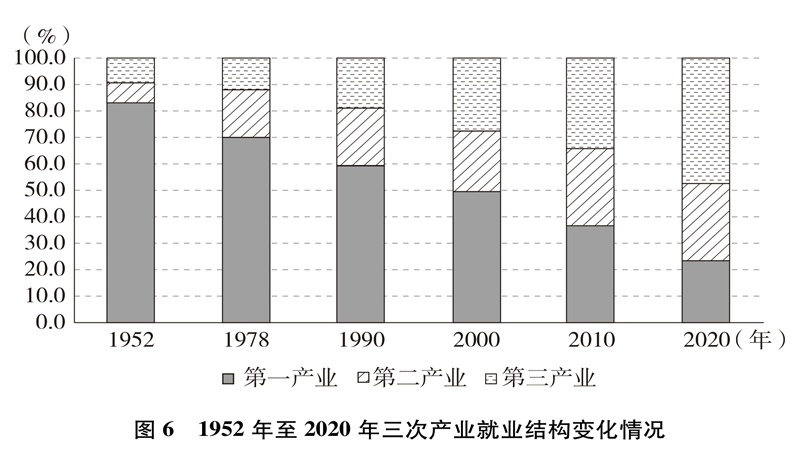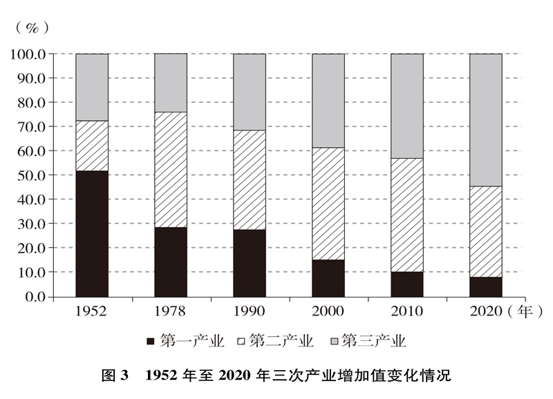 產(chǎn)業(yè)結構優(yōu)化升級。中國已建成世界上最完整的產(chǎn)業(yè)體系,產(chǎn)業(yè)發(fā)展持續(xù)向中高端邁進。三次產(chǎn)業(yè)增加值之比從1952年的50.5∶20.8∶28.7到2020年的7.7∶37.8∶54.5,中國從傳統(tǒng)農(nóng)業(yè)大國成為工業(yè)大國、服務業(yè)大國(圖3),中國經(jīng)濟從依賴單一產(chǎn)業(yè)為主轉向依靠三次產(chǎn)業(yè)共同帶動。農(nóng)業(yè)現(xiàn)代化成效顯著,機械化、數(shù)字化、綠色化、功能化、共享化水平明顯提高,廣大農(nóng)民逐步告別“面朝黃土背朝天、一身力氣百身汗”的辛勞,農(nóng)村生產(chǎn)力極大解放;糧食生產(chǎn)能力穩(wěn)步提升,實現(xiàn)谷物基本自給,中國人把飯碗牢牢端在自己手中。中國建成門類齊全、獨立完整的現(xiàn)代工業(yè)體系,工業(yè)化和信息化融合發(fā)展的廣度和深度不斷拓展,“中國制造”向“中國智造”轉型升級,產(chǎn)業(yè)鏈供應鏈現(xiàn)代化水平進一步提升。以新一代信息技術、生物技術、高端裝備、綠色環(huán)保為代表的戰(zhàn)略性新興產(chǎn)業(yè)發(fā)展迅速,成為引領高質量發(fā)展的重要引擎。數(shù)字經(jīng)濟激發(fā)經(jīng)濟發(fā)展新活力,產(chǎn)業(yè)數(shù)字化和數(shù)字產(chǎn)業(yè)化趨勢加快?,F(xiàn)代服務業(yè)加速發(fā)展,以“互聯(lián)網(wǎng)+”為標志的新業(yè)態(tài)、新模式層出不窮,平臺經(jīng)濟、共享經(jīng)濟蓬勃興起,生產(chǎn)性服務業(yè)向專業(yè)化和高端化發(fā)展,生活性服務業(yè)向精細化和高品質轉變。產(chǎn)業(yè)結構的優(yōu)化升級促進了經(jīng)濟更加均衡、更加充分的發(fā)展,人們個性化品質化多樣化需求不斷得到滿足。