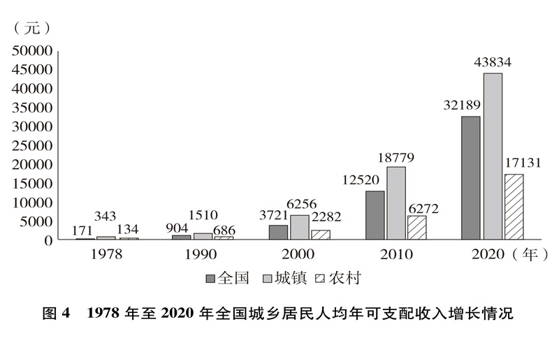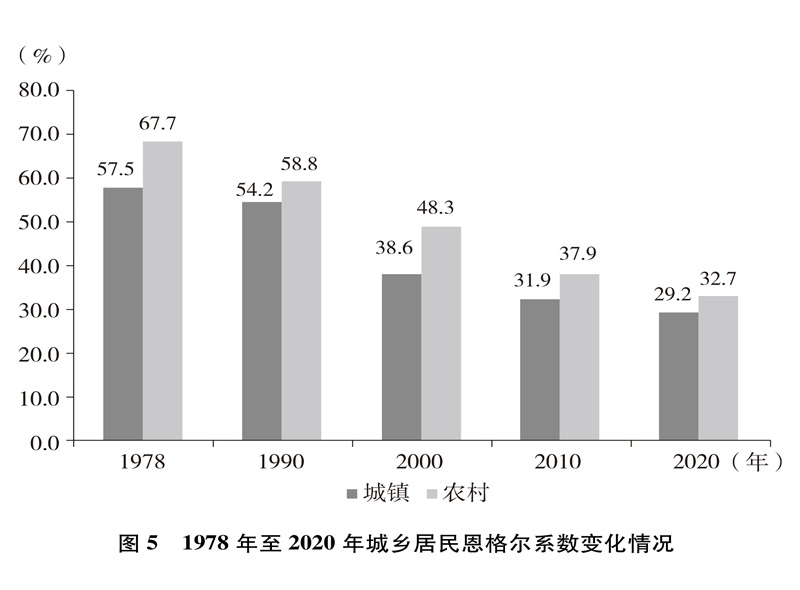 人民生活水平顯著提高。居民收入持續(xù)增加,全國居民人均年可支配收入從1978年的171元增加到2020年的32189元(圖4)。城鄉(xiāng)居民恩格爾系數(shù)分別從1978年的57.5%、67.7%下降到2020年的29.2%、32.7%(圖5),城鄉(xiāng)居民生活質量不斷提升。溫飽問題解決后,人們對生活品質、品位有了更高的追求,衣食住行不斷升級,消費結構從生存型逐漸向發(fā)展型、享受型過渡。衣,從穿暖到穿美、穿出時尚;食,從吃飽到吃好、吃出健康;住,從有所居到更敞亮、更宜居;行,從便利通暢到快捷舒適。吃穿用有余,家電全面普及,乘用汽車快速進入尋常百姓家。餐飲、健康、教育、旅游、文娛等服務性消費持續(xù)快速增長,在居民人均消費支出中占比逐漸達到一半左右。越來越多的人有“錢”有“閑”,“詩和遠方”更加觸手可及,“說走就走”不再是夢想,旅游扮靚人們的幸福生活,中國正在進入大眾旅游時代。