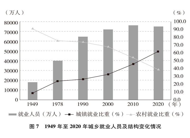 就業(yè)局勢長期穩(wěn)定,就業(yè)質量顯著提升。就業(yè)人數(shù)從1949年的1.8億增加到2020年的7.5億,就業(yè)規(guī)模不斷擴大;從絕大多數(shù)勞動者以農(nóng)業(yè)為生到第三產(chǎn)業(yè)就業(yè)人數(shù)占47.7%(圖6)、城鎮(zhèn)就業(yè)人數(shù)占61.6%(圖7),就業(yè)結構不斷優(yōu)化;從勞動者普遍處于文盲半文盲狀態(tài)到勞動年齡人口平均受教育年限10.8年、技能人才總量約2億,就業(yè)人員素質大幅提高。億萬勞動者擁有自己熱愛的工作,開啟幸福生活的大門。從計劃分配到市場就業(yè)、自由擇業(yè)、自主創(chuàng)業(yè),從傳統(tǒng)就業(yè)方式到新就業(yè)形態(tài),勞動者的就業(yè)觀念深刻變革、就業(yè)空間更加廣闊、就業(yè)方式日益多元。人們的興趣愛好、特長稟賦與個人就業(yè)意愿、社會需求、國家需要更好結合,自我價值更好實現(xiàn),主動性創(chuàng)造性顯著增強,創(chuàng)新創(chuàng)造熱情不斷迸發(fā)。勞動者合法權益得到保障,勞動報酬保持增長,勞動所得受到保護,人們越來越有尊嚴地勞動、快樂地勞動,依靠自己的雙手創(chuàng)造美好生活。從“單休制”到“雙休制”,從“黃金周”到帶薪年休假,勞動者休息休假權益越來越有保障,工作生活更加平衡。勞動最光榮、最崇高、最偉大、最美麗日益成為全社會的共識和行動,勤奮做事、勤勉為人、勤勞致富成為風尚,崇尚勞動、尊重勞動、熱愛勞動的社會氛圍更加濃厚。