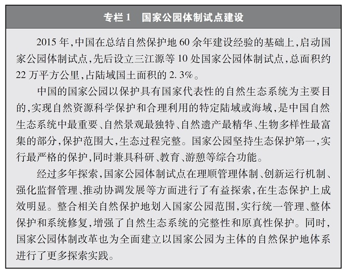 中國不斷推進自然保護地建設(shè),啟動國家公園體制試點,構(gòu)建以國家公園為主體的自然保護地體系,率先在國際上提出和實施生態(tài)保護紅線制度,明確了生物多樣性保護優(yōu)先區(qū)域,保護了重要自然生態(tài)系統(tǒng)和生物資源,在維護重要物種棲息地方面發(fā)揮了積極作用。