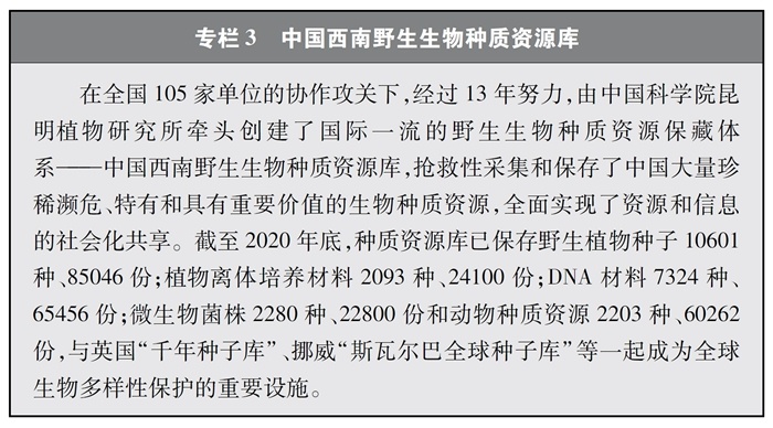 加快重要生物遺傳資源收集保存和利用。中國高度重視生物資源保護,近年來在生物資源調(diào)查、收集、保存等方面取得較大進展。實施戰(zhàn)略生物資源計劃專項,完善生物資源收集收藏平臺,建立種質(zhì)資源創(chuàng)新平臺、遺傳資源衍生庫和天然化合物轉(zhuǎn)化平臺,持續(xù)加強野生生物資源保護和利用。實施一批種質(zhì)資源保護和育種創(chuàng)新項目,截至2020年底,形成了以國家作物種質(zhì)長期庫及其復(fù)份庫為核心、10座中期庫與43個種質(zhì)圃為支撐的國家作物種質(zhì)資源保護體系,建立了199個國家級畜禽遺傳資源保種場(區(qū)、庫),為90%以上的國家級畜禽遺傳資源保護名錄品種建立了國家級保種單位,長期保存作物種質(zhì)資源52萬余份、畜禽遺傳資源96萬份。建設(shè)99個國家級林木種質(zhì)資源保存庫,以及新疆、山東2個國家級林草種質(zhì)資源設(shè)施保存庫國家分庫,保存林木種質(zhì)資源4.7萬份。建設(shè)31個藥用植物種質(zhì)資源保存圃和2個種質(zhì)資源庫,保存種子種苗1.2萬多份。