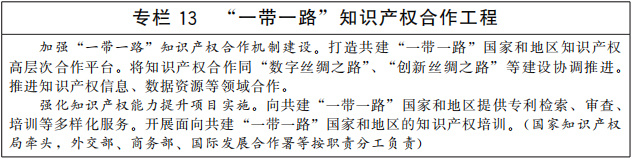 加強(qiáng)知識產(chǎn)權(quán)國際合作機(jī)制建設(shè)。鞏固和完善“一帶一路”知識產(chǎn)權(quán)合作,充分利用“一帶一路”知識產(chǎn)權(quán)合作平臺,擴(kuò)大合作項目規(guī)模和儲備。深度參與金磚國家、中美歐日韓、中日韓、中國—東盟等小多邊知識產(chǎn)權(quán)合作,加強(qiáng)與各方政策和業(yè)務(wù)規(guī)則交流,支持產(chǎn)業(yè)界積極參與相關(guān)合作機(jī)制。完善跨境司法協(xié)作安排,加強(qiáng)防范打擊侵犯知識產(chǎn)權(quán)犯罪國際合作。(中央宣傳部、最高人民法院、最高人民檢察院、外交部、公安部、商務(wù)部、海關(guān)總署、國家知識產(chǎn)權(quán)局等按職責(zé)分工負(fù)責(zé))