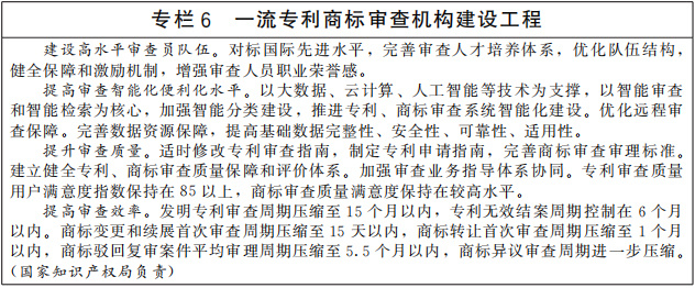提高知識產(chǎn)權(quán)審查質(zhì)量和審查效率。完善適應(yīng)創(chuàng)新發(fā)展需求的知識產(chǎn)權(quán)審查管理體系,優(yōu)化專利、商標(biāo)審查協(xié)作機(jī)制。提升專利商標(biāo)審查機(jī)構(gòu)能力水平,強(qiáng)化專利、商標(biāo)、版權(quán)、地理標(biāo)志、植物新品種全流程審查質(zhì)量管控,提升知識產(chǎn)權(quán)授權(quán)確權(quán)質(zhì)量。提高專利、商標(biāo)審查業(yè)務(wù)精細(xì)化管理水平,優(yōu)化審查資源配置,加強(qiáng)智能化技術(shù)運(yùn)用,提升審查效能,縮短審查周期。完善專利、商標(biāo)審查模式,加強(qiáng)審查與產(chǎn)業(yè)發(fā)展的政策協(xié)同和業(yè)務(wù)聯(lián)動,滿足產(chǎn)業(yè)綠色轉(zhuǎn)型和新領(lǐng)域新業(yè)態(tài)創(chuàng)新發(fā)展等社會多樣化需求。(中央宣傳部、工業(yè)和信息化部、農(nóng)業(yè)農(nóng)村部、國家林草局、國家知識產(chǎn)權(quán)局等按職責(zé)分工負(fù)責(zé))