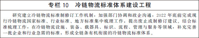 加強冷鏈物流標準制修訂。加強冷鏈基礎(chǔ)通用標準和冷鏈基礎(chǔ)設(shè)施、技術(shù)裝備、作業(yè)流程、信息追溯等重點環(huán)節(jié)以及冷鏈物流綠色化、智慧化等重點領(lǐng)域標準制修訂,加快填補標準空白。制定一批強制性國家標準,守好冷鏈產(chǎn)品安全底線。加強冷鏈物流推薦性國家標準、行業(yè)標準推陳出新,支持地方因地制宜制定符合發(fā)展需要的地方標準,鼓勵高起點制定團體標準和企業(yè)標準。積極參與冷鏈物流國際標準化活動,推動國內(nèi)國際標準接軌。