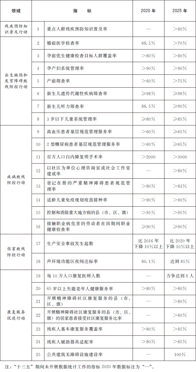 到2025年,覆蓋經(jīng)濟(jì)社會(huì)發(fā)展各領(lǐng)域的殘疾預(yù)防政策體系進(jìn)一步完善,全人群全生命周期殘疾預(yù)防服務(wù)網(wǎng)絡(luò)更加健全,全民殘疾預(yù)防素養(yǎng)明顯提升,遺傳和發(fā)育、疾病、傷害等主要致殘因素得到有效防控,殘疾康復(fù)服務(wù)狀況持續(xù)改善,殘疾預(yù)防主要指標(biāo)處于中高收入國家前列。