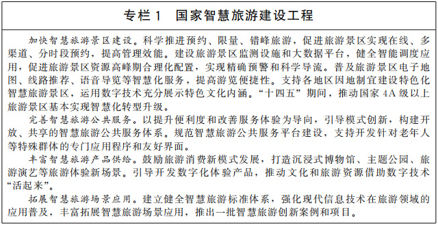 打造一批智慧旅游城市、旅游景區(qū)、度假區(qū)、旅游街區(qū),培育一批智慧旅游創(chuàng)新企業(yè)和重點(diǎn)項(xiàng)目,開發(fā)數(shù)字化體驗(yàn)產(chǎn)品,發(fā)展沉浸式互動(dòng)體驗(yàn)、虛擬展示、智慧導(dǎo)覽等新型旅游服務(wù),推進(jìn)以“互聯(lián)網(wǎng)+”為代表的旅游場(chǎng)景化建設(shè)。提升旅游景區(qū)、度假區(qū)等各類旅游重點(diǎn)區(qū)域5G網(wǎng)絡(luò)覆蓋水平。推動(dòng)停車場(chǎng)、旅游集散中心、旅游咨詢中心、游客服務(wù)中心、旅游專用道路、旅游廁所及旅游景區(qū)、度假區(qū)內(nèi)部引導(dǎo)標(biāo)識(shí)系統(tǒng)等數(shù)字化、智能化改造升級(jí)。通過互聯(lián)網(wǎng)有效整合線上線下資源,促進(jìn)旅行社等旅游企業(yè)轉(zhuǎn)型升級(jí),鼓勵(lì)旅游景區(qū)、度假區(qū)、旅游飯店、主題公園、民宿等與互聯(lián)網(wǎng)服務(wù)平臺(tái)合作建設(shè)網(wǎng)上旗艦店。鼓勵(lì)依法依規(guī)利用大數(shù)據(jù)等手段,提高旅游營銷傳播的針對(duì)性和有效性。
