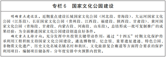 推進(jìn)國家文化公園建設(shè),生動(dòng)呈現(xiàn)中華文化的獨(dú)特創(chuàng)造、價(jià)值理念和鮮明特色,樹立和突出各民族共享的中華文化符號(hào)和中華民族形象,探索新時(shí)代文物和文化資源保護(hù)傳承利用新路徑,把國家文化公園建設(shè)成為傳承中華文明的歷史文化走廊、中華民族共同精神家園、提升人民生活品質(zhì)的文化和旅游體驗(yàn)空間。加快建設(shè)長城、大運(yùn)河、長征、黃河等國家文化公園,整合具有突出意義、重要影響、重大主題的文物和文化資源,重點(diǎn)建設(shè)管控保護(hù)、主題展示、文旅融合、傳統(tǒng)利用四類主體功能區(qū),實(shí)施保護(hù)傳承、研究發(fā)掘、環(huán)境配套、文旅融合、數(shù)字再現(xiàn)五大工程,突出“萬里長城”“千年運(yùn)河”“兩萬五千里長征”“九曲黃河”整體辨識(shí)度。推進(jìn)優(yōu)質(zhì)文化旅游資源一體化開發(fā),科學(xué)規(guī)劃、開發(fā)文化旅游產(chǎn)品和商品。推出參觀游覽聯(lián)程聯(lián)運(yùn)經(jīng)典線路,開展整體品牌塑造和營銷推介。