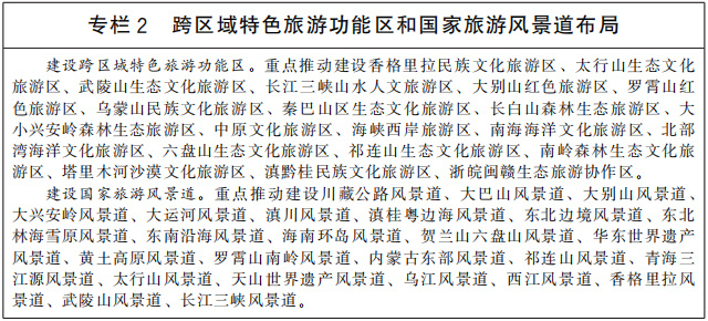綜合考慮文脈、地脈、水脈、交通干線和國家重大發(fā)展戰(zhàn)略,統(tǒng)籌生態(tài)安全和旅游業(yè)發(fā)展,以長城、大運(yùn)河、長征、黃河國家文化公園和絲綢之路旅游帶、長江國際黃金旅游帶、沿海黃金旅游帶、京哈—京港澳高鐵沿線、太行山—武陵山、萬里茶道等為依托,構(gòu)建“點(diǎn)狀輻射、帶狀串聯(lián)、網(wǎng)狀協(xié)同”的全國旅游空間新格局。健全京津冀協(xié)同發(fā)展、長江經(jīng)濟(jì)帶發(fā)展、粵港澳大灣區(qū)建設(shè)、長三角一體化發(fā)展、黃河流域生態(tài)保護(hù)和高質(zhì)量發(fā)展等區(qū)域重大戰(zhàn)略旅游協(xié)調(diào)機(jī)制,推進(jìn)跨行政區(qū)域旅游資源整合利用。加強(qiáng)區(qū)域旅游品牌和服務(wù)整合,支持京張?bào)w育文化旅游帶、黃河文化旅游帶、巴蜀文化旅游走廊、杭黃自然生態(tài)和文化旅游廊道、太行山區(qū)等旅游發(fā)展。持續(xù)推進(jìn)跨區(qū)域特色旅游功能區(qū)建設(shè)。繼續(xù)推出一批國家旅游風(fēng)景道和自駕游精品線路,打造一批世界級(jí)、國家級(jí)旅游線路。鼓勵(lì)各地區(qū)因地制宜實(shí)現(xiàn)差異化發(fā)展。